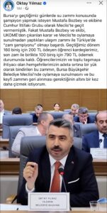 “Ben bir Yıldırımlı olarak, Yıldırımlıların hakkını savunmaya devam edeceğim. Çünkü bu koltukta oturan hiç kimsenin, bu halkın alın terini rant sofralarına meze etmeye hakkı yoktur.