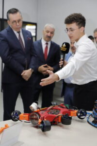 Final öncesinde protokol üyeleri ve jüri heyeti, Mesafe Koleji İnovasyon Servisi’ni ziyaret ederek öğrencilerin geleceği dönüştürmeye aday projelerini ilgiyle inceledi. Program, okul kurucusu Mustafa Dağlı’nın ilham veren açılış konuşmasıyla başladı.